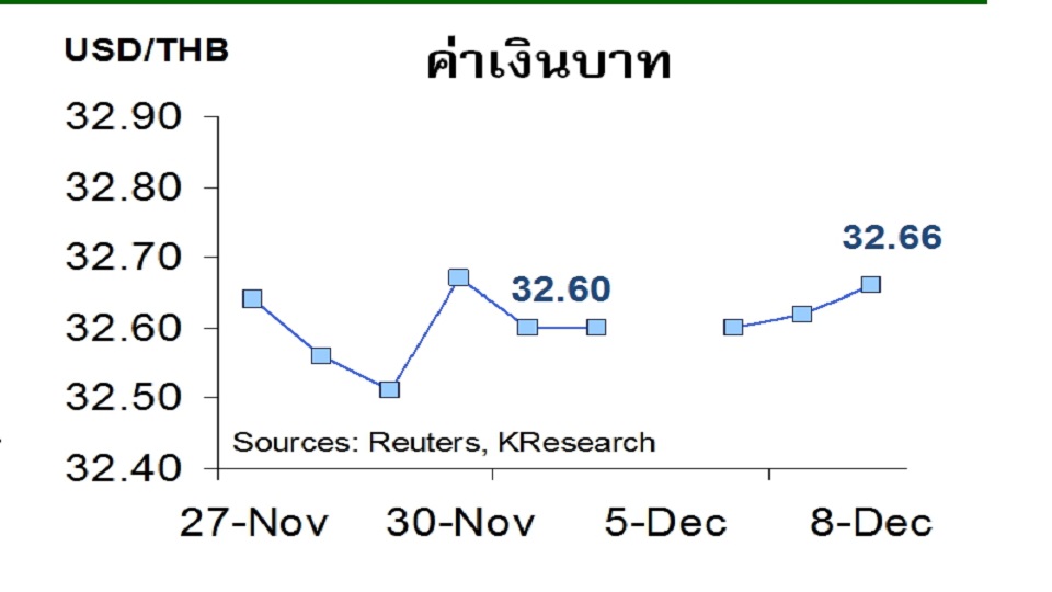 ศูนย์วิจัยกสิกรไทย สรุปความเคลื่อนไหวของค่าเงินบาทสัปดาห์นี้ว่า เงินบาททรงตัวในกรอบแคบๆ ที่ระดับประมาณ 32.60 บาทต่อดอลลาร์ฯ ก่อนจะทยอยอ่อนค่าในช่วงปลายสัปดาห์ ทั้งนี้ เงินบาทขยับอ่อนค่าลง หลังจากที่เงินดอลลาร์ฯ ทยอยได้รับแรงหนุนมากขึ้นจากตัวเลขเศรษฐกิจสหรัฐฯ ที่ออกมาดีกว่าที่คาด เช่น ตัวเลขการจ้างงานภาคเอกชน ตลอดจนความหวังต่อมาตรการปฏิรูปภาษีของสหรัฐฯ ที่เพิ่มขึ้น หลังจากที่สภาคองเกรสสามารถผ่านร่างกฎหมายต่ออายุการจัดสรรเงินทุนเป็นการชั่วคราวให้แก่หน่วยงานรัฐบาล ซึ่งช่วยลดความเสี่ยงในการปิดหน่วยงานราชการของสหรัฐฯ จนถึงวันที่ 22 ธ.ค. นี้