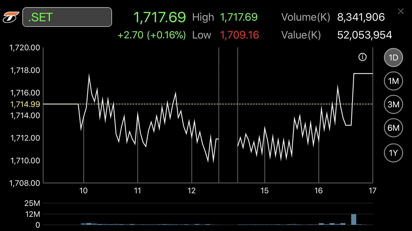 การซื้อขายหุ้นวันนี้ ดัชนีหุ้นไทยเคลื่อนไหวในแดนบวกและแดนลบสลับกัน โดยดัชนีฯแตะจุดสูงสุดที่ 1,717.69 จุด และแตะจุดต่ำสุดที่ระดับ 1,709.16 จุด