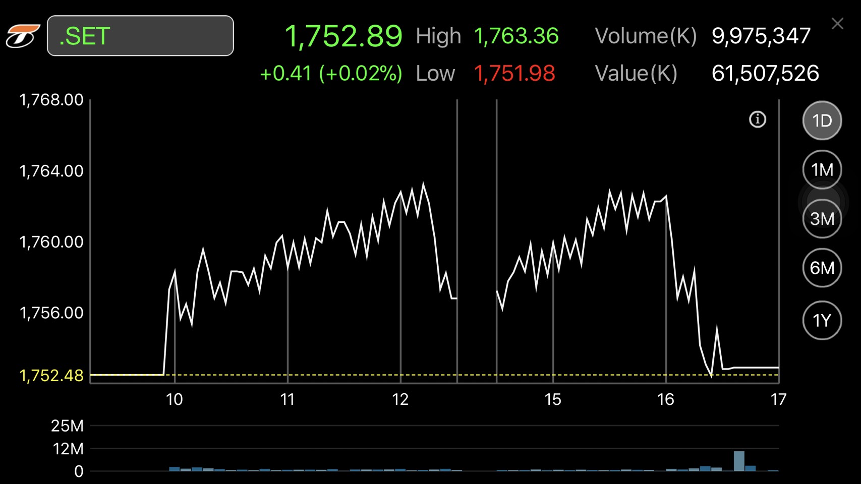 การซื้อขายหุ้นวันนี้ ดัชนีหุ้นไทยเคลื่อนไหวในแดนบวกตลอดทั้งวัน โดยดัชนีฯแตะจุดสูงสุดที่ 1,763.36 จุด และแตะจุดต่ำสุดที่ระดับ 1,751.98 จุด