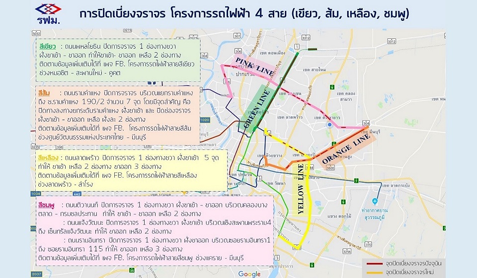 การรถไฟฟ้าขนส่งมวลชนแห่งประเทศไทย (รฟม.) แจ้งว่า รฟม.ซึ่งผู้รับผิดชอบโครงการรถไฟฟ้าที่อยู่ระหว่างดำเนินการก่อสร้างงานโยธาในเขตกรุงเทพฯ และปริมณฑล ทั้ง 4 สายทาง ได้เตรียมความพร้อมด้านการจัดการจราจรเพื่อรองรับการเปิดภาคเรียนที่ 1 ของโรงเรียนระดับมัธยมศึกษา ประจำปีการศึกษา 2561 ซึ่งจะเริ่มทยอยเปิดกันตั้งแต่วันที่ 16 – 21 พฤษภาคม 2561 นี้ โดย รฟม. ได้จัดทำแผนที่แสดงแนวเส้นทางปิดเบี่ยงจราจรของโครงการรถไฟฟ้า เพื่อให้ประชาชนที่ต้องเดินทางผ่านเส้นทางดังกล่าวเข้าไปตรวจสอบข้อมูลได้ที่ เฟซบุ๊กแฟนเพจการรถไฟฟ้าขนส่งมวลชนแห่งประเทศไทย สำหรับแผนที่แสดงแนวเส้นทางประกอบด้วย ข้อมูลจุดปิดเบี่ยงจราจรของโครงการรถไฟฟ้าในภาพรวมทั้ง 4 สายทาง และช่องทางตรวจสอบเส้นทางลัดทางเลี่ยงของแต่ละจุด เพื่อใช้ควบคู่กับ Google Map ดังนี้