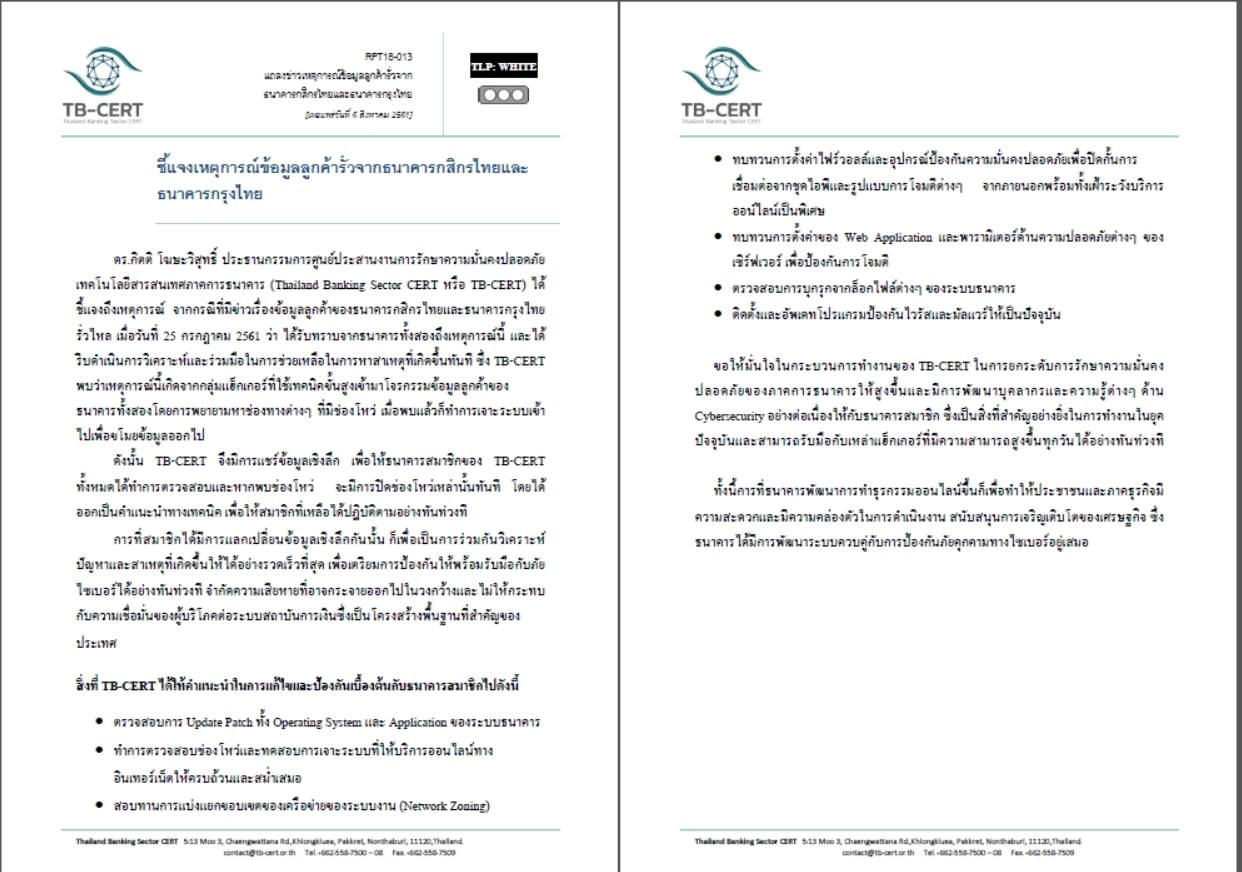 นายกิตติ โฆษะวิสุทธิ์ ประธานกรรมการศูนย์ประสานงานการรักษาความมั่นคงปลอดภัยเทคโนโลยีสารสนเทศภาคการธนาคาร (TB-CERT) ชี้แจงกรณีข้อมูลลูกค้าของธนาคารกสิกรไทยและธนาคารกรุงไทยรั่วเมื่อวันที่ 25 กรกฎาคม 2561 ว่า ได้รับทราบจากธนาคารทั้ง 2 ถึงเหตุการณ์นี้ และได้รีบดำเนินการวิเคราะห์และร่วมมือในการช่วยเหลือในการหาสาเหตุที่เกิดขึ้นทันที ซึ่ง TB-CERT พบว่าเหตุการณ์นี้เกิดจากกลุ่มแฮกเกอร์ที่ใช้เทคนิคขั้นสูงเข้ามาโจรกรรมข้อมูลลูกค้าของธนาคารทั้ง 2 โดยการพยายามหาช่องทางต่าง ๆ ที่มีช่องโหว่ เมื่อพบแล้วก็ทำการเจาะระบบเข้าไปเพื่อขโมยข้อมูลออกไป ดังนั้น TB-CERT จึงมีการแชร์ข้อมูลเชิงลึก เพื่อให้ธนาคารสมาชิกของ TB-CERT ทั้งหมดทำการตรวจสอบและหากพบช่องโหว่จะมีการปิดช่องโหว่เหล่านั้นทันที โดยได้ออกเป็นคำแนะนำทางเทคนิค เพื่อให้สมาชิกที่เหลือได้ปฏิบัติตามอย่างทันท่วงที