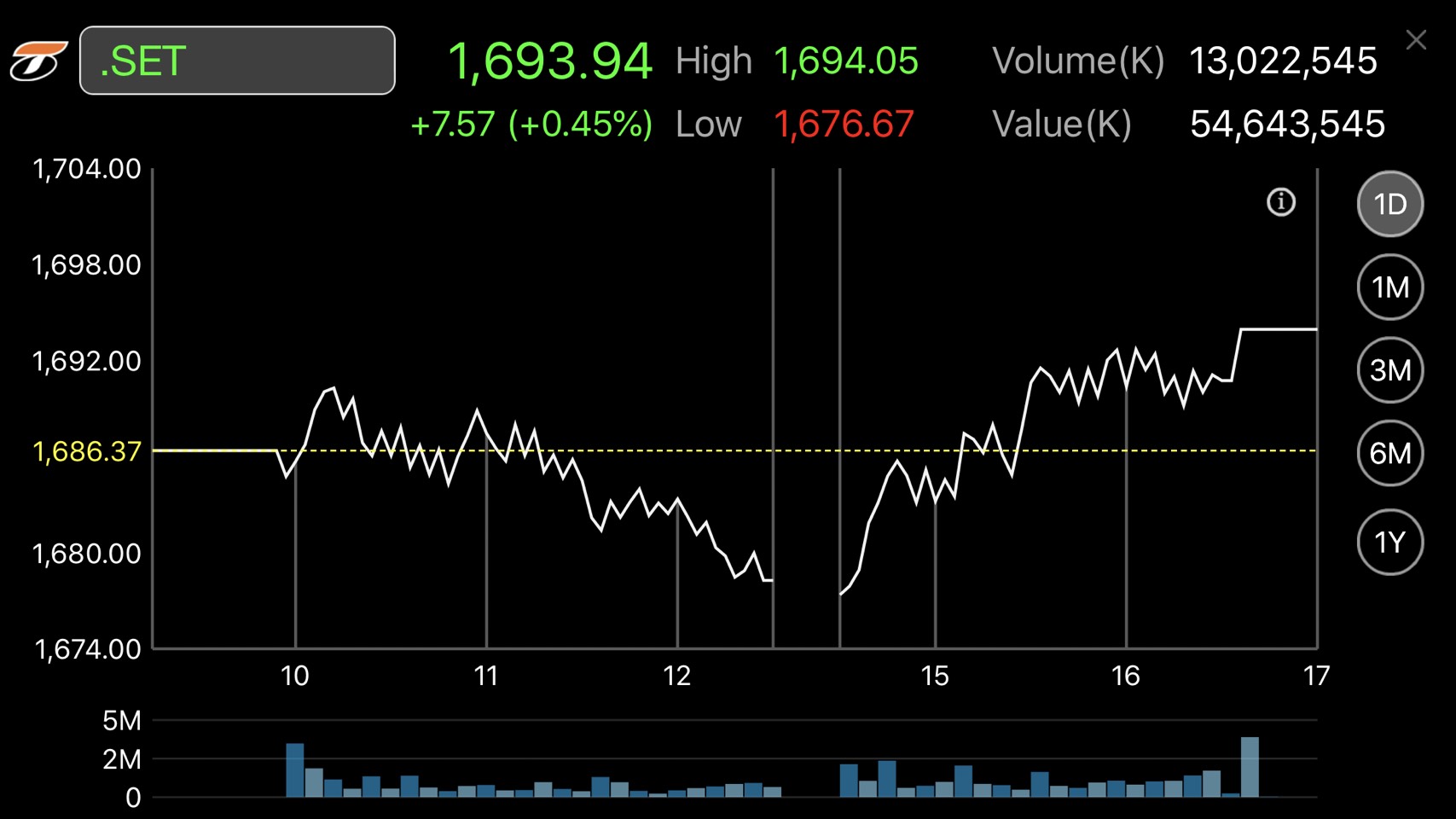 ผู้สื่อข่าวรายงานว่า ตลาดหลักทรัพย์ปิดวันนี้ที่ระดับ 1,693.94 จุด เพิ่มขึ้น 7.57 จุด (+0.45%) มูลค่าการซื้อขาย 54,643.55 ล้านบาท