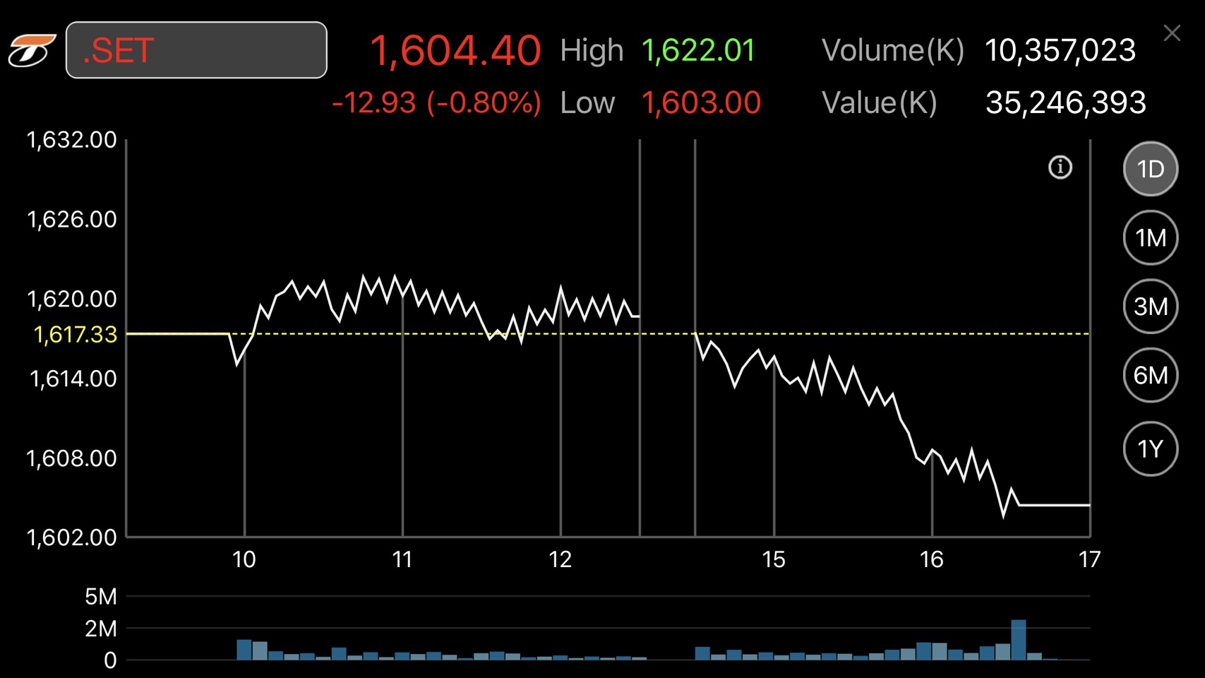 ตลาดหลักทรัพย์ปิดวันนี้ที่ระดับ 1,604.40 จุด ลดลง 12.93 จุด (-0.80%) มูลค่าการซื้อขาย 35,246.39 ล้านบาท การซื้อขายหุ้นวันนี้ ดัชนีหุ้นไทยเคลื่อนไหวทั้งในแดนบวก-ลบ โดยดัชนีฯแตะจุดสูงสุดที่ 1,622.01 จุด และแตะจุดต่ำสุดที่ระดับ 1,603.00 จุด