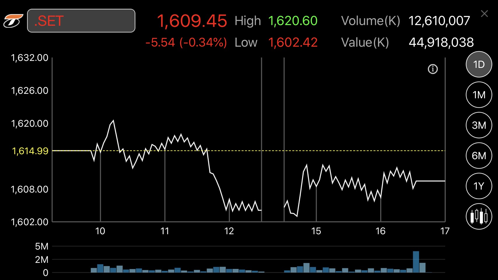 ตลาดหลักทรัพย์ปิดวันนี้ที่ระดับ 1,609.45 จุด ลดลง 5.54 จุด หรือร้อยละ0.34 มูลค่าการซื้อขาย 44,918.04 ล้านบาท