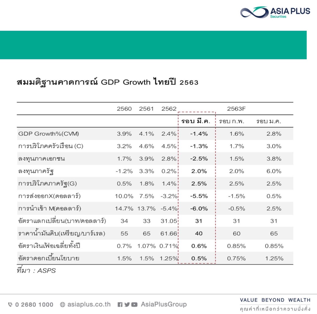 นายฐกฤต ชาติเชิดศักดิ์ นักเศรษฐศาสตร์ สายงานวิจัย บล.เอเซีย พลัส กล่าวว่าได้ปรับลดคาดการณ์อัตราการขยายตัวเศรษฐกิจไทยปีนี้เป็นครั้งที่ 3 เหลือหดตัว 1.4% จากเดิมที่คาดขยายตัว1.6% โดยพบว่า มีหลายปัจจัยที่รุมเร้าทั้งจากปัจจัยต่างประเทศและปัจจัยภายใน การปรับลดจีดีพีครั้งนี้ภายใต้สมมติฐานที่ว่าการระบาดของโควิด-19 จะสามารถควบคุมได้ ในไตรมาส 3/63 นี้