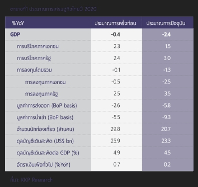 ฝ่ายวิจัยเศรษฐกิจและกลยุทธ์ กลุ่มธุรกิจการเงินเกียรตินาคินภัทร หรือ KKP Research ปรับประมาณการอัตราการขยายตัวทางเศรษฐกิจของไทยลงอีกครั้งจาก -0.4% เป็น -2.4% เนื่องจากการแพร่ระบาดของไวรัสควิด-19 ที่แพร่กระจายและมีจำนวนผู้ติดเชื้อนอกประเทศจีนเพิ่มขึ้นมากกว่า 10 เท่าตัวจนทำให้ยอดรวมขณะนี้ ทะลุ 200,000 คนทั่วโลก ทำให้รัฐบาลของหลายประเทศ โดยเฉพาะในยุโรปต่างทยอยออกมาตรการเข้มทั้งด้านการควบคุมการเดินทางและการปิดเมือง (lockdown)เพื่อสกัดกั้นการแพร่ระบาดของเชื้อไวรัสซึ่งเป็นมาตรการที่จำเป็น แต่ก็ส่งผลกระทบต่อเศรษฐกิจอย่างหลีกเลี่ยงไม่ได้