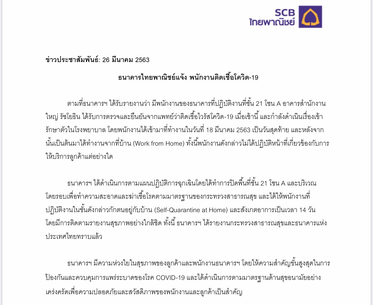 ตามที่ธนาคารฯ ได้รับรายงานว่า มีพนักงานของธนาคารที่ปฏิบัติงานที่ชั้น 21 โซน A อาคารสำนักงานใหญ่ รัชโยธิน ได้รับการตรวจและยืนยันจากแพทย์ว่าติดเชื้อไวรัสโควิด-19 เมื่อเช้านี้ และกำลังดำเนินเรื่องเข้ารักษาตัวในโรงพยาบาล โดยพนักงานได้เข้ามาที่ทำงานในวันที่ 18 มีนาคม 2563 เป็นวันสุดท้าย และหลังจากนั้นเป็นต้นมาได้ทำงานจากที่บ้าน (Work from Home) ทั้งนี้พนักงานดังกล่าวไม่ได้ปฏิบัติหน้าที่เกี่ยวข้องกับการให้บริการลูกค้าแต่อย่างใด