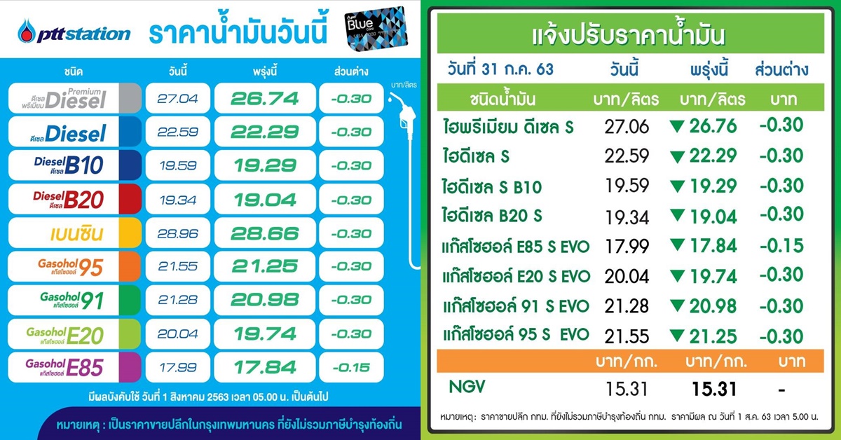 ผู้ค้าน้ำมัน PTT Station และบางจากฯ ปรับลดราคาขายปลีกน้ำมันทุกชนิดลง 30 สตางค์ต่อลิตร ยกเว้น E85 ลดลง 15 สตางค์ต่อลิตร มีผล 1 สิงหาคม 2563 เวลา 05.00 น. เป็นต้นไป โดยราคาขายปลีก ปตท.จะเป็นดังนี้ เบนซิน 28.66 บาท แก๊สโซฮอล์ 95 ลิตรละ 21.25 บาท E20 ลิตรละ 19.74 บาท แก๊สโซฮอล์ 91 ลิตรละ 20.98 บาท E85 ลิตรละ 17.84 บาท ดีเซล 26.74 บาท B10 ลิตรละ 19.29 บาท B20 ลิตรละ 18.34 บาท และดีเซลพรีเมี่ยม 26.74 บาทต่อลิตร โดยราคาขายปลีกข้างต้นยังไม่รวมภาษีบำรุงกรุงเทพมหานคร