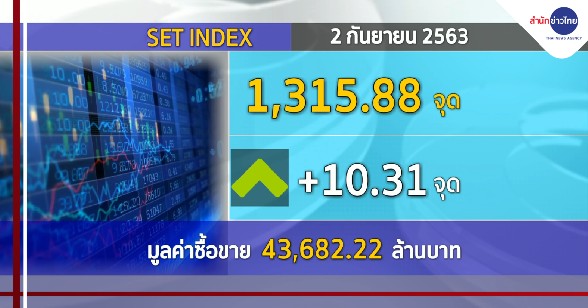 กรุงเทพฯ 2 ก.ย.-ดัชนีตลาดหลักทรัพย์ฯ ปิดวันนี้ (2 ก.ย.) ที่ระดับ 1,315.88 จุด เพิ่มขึ้น 10.31 จุด (0.79%) มูลค่าการซื้อขาย 43,682.22 ล้านบาท