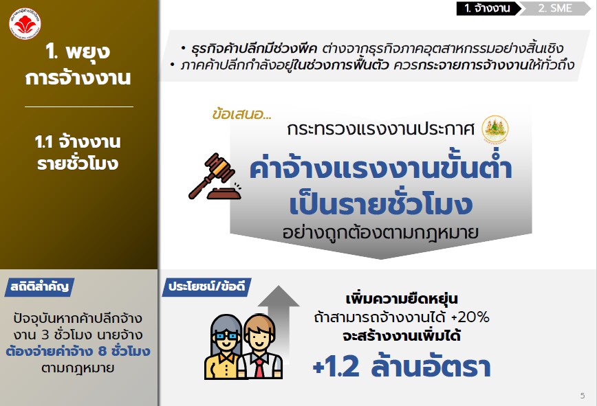 1.1 จ้างงานรายชั่วโมง ทั้งนี้เนื่องจากธุรกิจการค้าปลีกสินค้าและบริการมีช่วงเวลาการให้บริการที่ไม่สม่ำเสมอ ช่วงที่ลูกค้าหนาแน่นก็จะเป็นช่วงเที่ยงและช่วงเย็น รวมทั้งเสาร์ อาทิตย์ ซึ่งแตกต่างจากการดำเนินงานภาคผลิตอย่างสิ้นเชิง หากภาครัฐประกาศอัตราค่าจ้างแรงงานขั้นต่ำเป็นรายชั่วโมงในช่วงการฟื้นตัวเศรษฐกิจ ก็จะช่วยกระจายการจ้างงานได้ ขณะเดียวกัน ลูกจ้างก็จะสามารถรับงานได้ยืดหยุ่นและมีระยะเวลาทำงานได้มากขึ้น (สามารถทำงานได้กับหลายบริษัทใน 1 วันได้) ส่วนนายจ้างก็สามารถเพิ่มอัตราการจ้างงานให้เหมาะสมกับช่วงเวลาที่ต้องการได้ สมาคมฯจึงขอเสนอให้กระทรวงแรงงานประกาศค่าจ้างแรงงานขั้นต่ำเป็นรายชั่วโมงอย่างถูกต้องตามกฎหมาย เพื่อเพิ่มความยืดหยุ่น โดยหากสามารถจ้างงานได้มากกว่า 20% จะสามารถสร้างงานเพิ่มได้มากกว่า 1.2 ล้านอัตรา ซึ่งจะเป็นประโยชน์ไม่เฉพาะภาคการค้าปลีก แต่จะเป็นประโยชน์กับทุกภาคส่วนและทุกขนาดของธุรกิจ ไม่ว่าจะเป็น ธุรกิจ โรงแรม ร้านอาหาร ภัตตาคาร และธุรกิจบริการอื่นๆ อีกด้วย