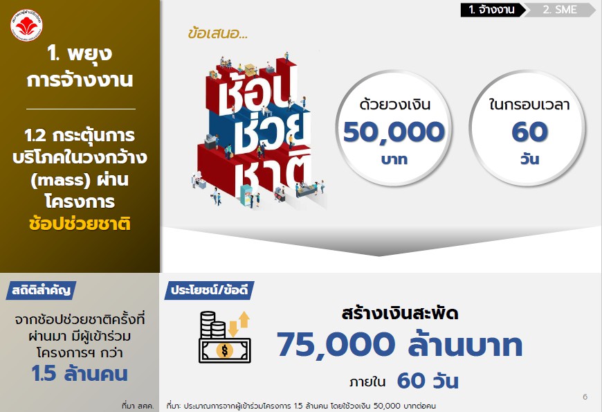 1.2 กระตุ้นการบริโภคในวงกว้างผ่านโครงการช้อปช่วยชาติ ด้วยวงเงิน 50,000 บาท ในกรอบเวลา 60 วัน ซึ่งจะสามารถสร้างเงินสะพัด 75,000 ล้านบาท ภายใน 60 วัน