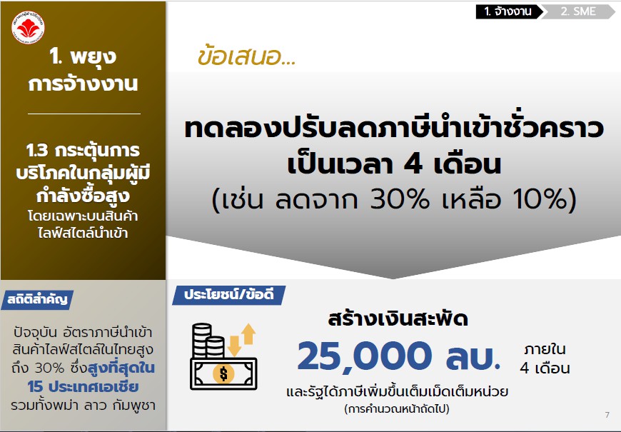 1.3 กระตุ้นการบริโภคในกลุ่มผู้มีกำลังซื้อสูง โดยเฉพาะสินค้าไลฟ์สไตล์นำเข้า ซึ่งปัจจุบันอัตราภาษีนำเข้าสินค้าไลฟ์สไตล์ในไทยสูงถึง 30% ซึ่งสูงที่สุดใน 15 ประเทศในแถบเอเชีย ทำให้คนหันไปซื้อสินค้าที่ต่างประเทศแทน จึงเสนอให้ทดลองปรับลดภาษีนำเข้าชั่วคราวเป็นเวลา 4 เดือน เช่น ลดจากเดิม 30% เป็น 10% จะสามารถสร้างเงินสะพัดได้ถึง 25,000 ล้านบาท ภายใน 4 เดือน
