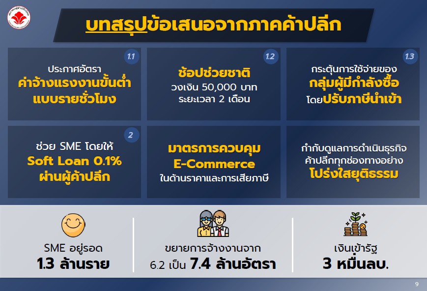 2.ขับเคลื่อน SME ให้อยู่รอดและแข็งแรง เสนอให้มีการปล่อยเงินกู้ดอกเบี้ยต่ำ (Soft Loan) 0.1% ผ่านผู้ค้าปลีกรายใหญ่ โดยใช้งบประมาณ 25,000 ล้านบาท จากวงเงิน 5 แสนล้านบาท ที่รัฐตั้งไว้แล้ว เร่งจ่ายเงิน SME ขนาดเล็กจากเดิม 30 วัน เป็นภายใน 7 วัน ส่งผลให้สามารถเพิ่มสภาพคล่องสู่ SME กว่า 5 แสนรายและไม่สร้างหนี้เสียให้ธนาคารพาณิชย์