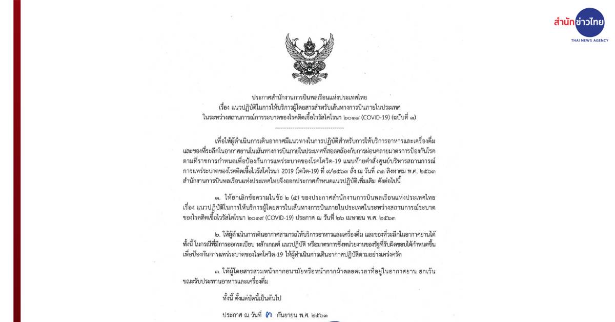 นายจุฬา สุขมานพ ผู้อำนวยการสำนักงานการบินพลเรือนแห่ประเทศไทย (กพท.) เปิดเผยว่า ได้ประกาศสำนักงานการบินพลเรือนแห่งประเทศไทย เรื่องแนวปฏิบัติในการให้บริการผู้โดยสารสำหรับเส้นทางการบินภายในประเทศในระหว่างสถานการณ์การระบาดของโรคติดเชื้อไวรัสโคโรนา 2019 (COVID-19) (ฉบับที่ 3) เพื่อให้ผู้ดำเนินการเดินอากาศมีแนวทางในการปฏิบัติสำหรับการให้บริการอาหารและเครื่องดื่มและของที่ระลึกในอากาศยานในเส้นทางการบินภายในประเทศ