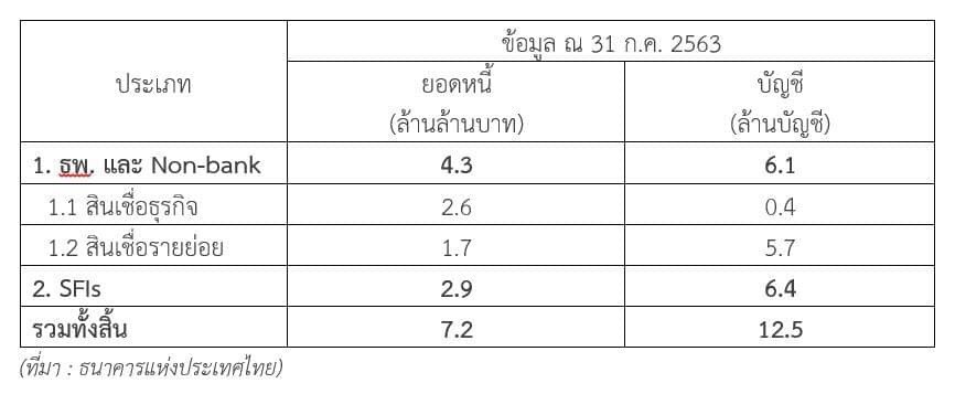 นายจาตุรงค์ จันทรังษ์ ผู้ช่วยผู้ว่าการ สายกำกับสถาบันการเงิน 1 ธปท. เปิดเผยถึงความคืบหน้าของมาตรการให้ความช่วยเหลือลูกหนี้รายย่อยและลูกหนี้ธุรกิจที่ได้รับผลกระทบจากโควิด 19 ว่า จากข้อมูลล่าสุด ณ 31 กรกฎาคม 2563 มีลูกหนี้ที่ได้รับความช่วยเหลือทางการเงินทั้งสิ้น 7.2 ล้านล้านบาท คิดเป็น 12.5 ล้านบัญชี โดยเป็นยอดหนี้ธนาคารพาณิชย์ และ สถาบันการเงินที่ไม่ใช่ธนาคารพาณิชย์ ( นอนแบงก์) 4.3 ล้านล้านบาท คิดเป็น 6.1 ล้านบัญชี เป็นความช่วยเหลือทางการเงินแก่ลูกหนี้ธุรกิจ 2.6 ล้านล้านบาท คิดเป็น 400,000 บัญชี และสินเชื่อรายย่อย 1.7 ล้านล้านบาท คิดเป็น 5.7 ล้านบัญชี ส่วนความช่วยเหลือผ่านทางธนาคารเฉพาะกิจ มียอดหนี้ 2.9 ล้านล้านบาท คิดเป็น6.4 ล้านบัญชี ครอบคลุมทั้งการเลื่อนพักชำระหนี้ การลดภาระผ่อนชำระต่อเดือนด้วยการขยายระยะเวลาชำระหนี้ตามสัญญา การลดอัตราดอกเบี้ย รวมถึงการปรับปรุงโครงสร้างหนี้ด้วยการปรับเงื่อนไขการชำระหนี้ตามสัญญาใหม่