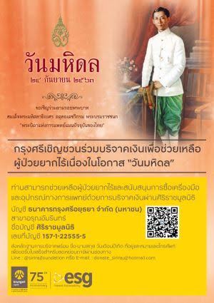 กรุงเทพฯ 9 ก.ย. – ธนาคารกรุงศรีอยุธยา จำกัด (มหาชน) ขอเชิญชวนร่วมบริจาคเงินเพื่อช่วยเหลือผู้ป่วยยากไร้และสนับสนุนการซื้อเครื่องมือและอุปกรณ์ทางการแพทย์ เนื่องในโอกาสวันมหิดล ผ่านบัญชีธนาคารกรุงศรีอยุธยา จำกัด (มหาชน) สาขาอรุณอัมรินทร์ ชื่อบัญชี ศิริราชมูลนิธิ เลขที่ 157-1-22555-5 ทุกการบริจาคสามารถนำไปลดหย่อนภาษีได้ โดยส่งหลักฐานการบริจาคพร้อมชื่อ-นามสกุล วันเดือนปีเกิด ที่อยู่และหมายเลขโทรศัพท์ ผ่านช่องทาง Line : @sirirajfoundation หรือ E-mail. : donate_siriraj@hotmail.com ติดต่อสอบถามเพิ่มเติมได้ที่ : ศิริราชมูลนิธิ โทร. 0-2414-1414, 0-2419-7688.-สำนักข่าวไทย