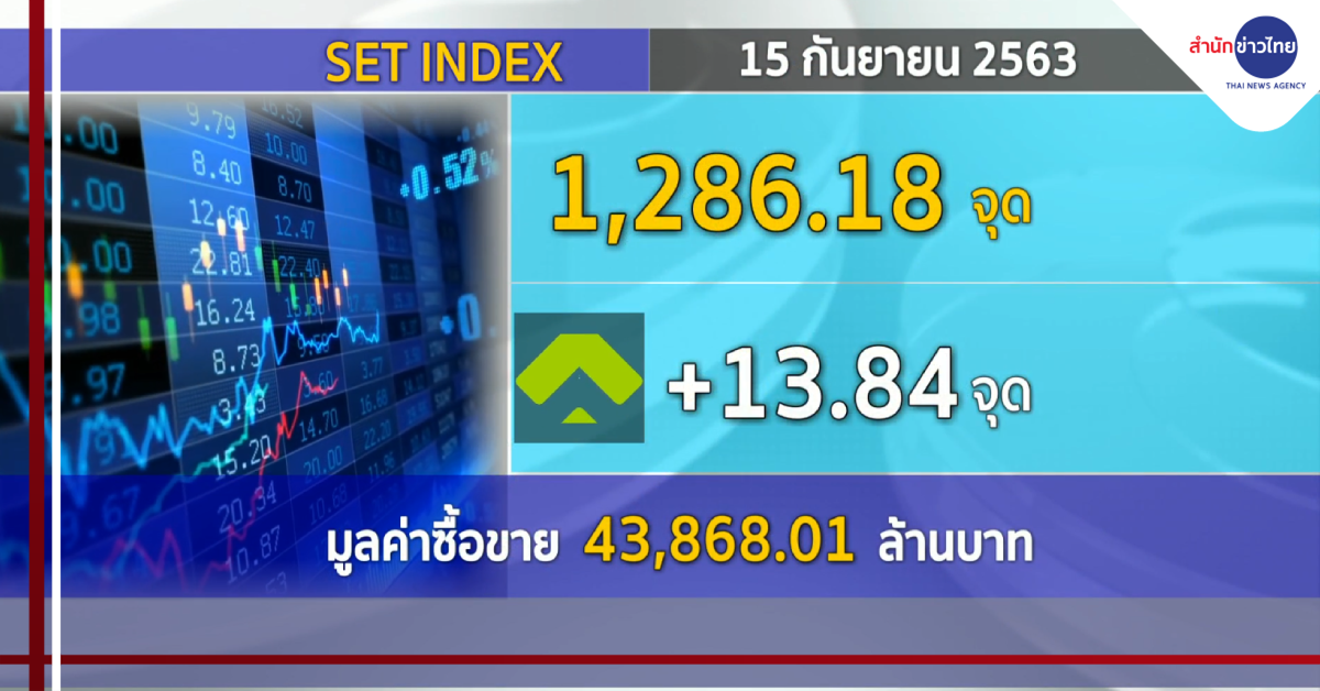 กรุงเทพฯ 15 ก.ย.-หุ้นไทยปิดวันนี้ที่ระดับ 1,286.18 จุด เพิ่มขึ้น 13.84 จุด มูลค่าการซื้อขาย 43,868.01 ล้านบาท