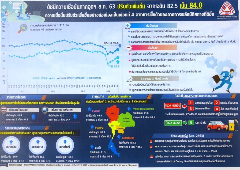 นายสุพันธุ์ มงคลสุธี ประธานสภาอุตสาหกรรมแห่งประเทศไทย (ส.อ.ท.) เปิดเผยว่า ดัชนีความเชื่อมั่นภาคอุตสาหกรรมเดือนสิงหาคม 2563 อยู่ที่ระดับ 84.0 ปรับตัวเพิ่มขึ้นจากระดับ 82.5 ในเดือนกรกฎาคม 2563 เป็นการปรับตัวเพิ่มขึ้นต่อเนื่องเป็นเดือนที่ 4 เนื่องจากหน่วยงานภาครัฐ เอกชน และประชาชนร่วมมือกันจนสามารถควบคุมการแพร่ระบาดของโควิด-19 ได้อย่างมีประสิทธิภาพ รวมทั้งการผ่อนคลายมาตรการควบคุมโรค ทำให้กิจกรรมทางเศรษฐกิจภายในประเทศสามารถกลับมาดำเนินการตามปกติ ขณะที่ภาคการผลิตขยายตัวเพิ่มขึ้นจากเดือนก่อนหน้าตามความต้องการสินค้าที่เพิ่มขึ้น สำหรับอุตสาหกรรมที่ส่งผลดีต่อค่าดัชนีฯ เช่น รถยนต์ เครื่องใช้ไฟฟ้า เครื่องจักรกล อาหาร และสินค้าวัสดุก่อสร้าง เป็นต้น