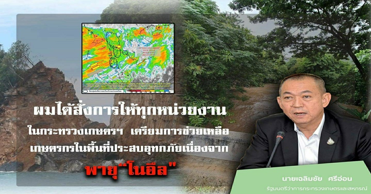 นายเฉลิมชัย ศรีอ่อน รัฐมนตรีว่าการกระทรวงเกษตรและสหกรณ์ กล่าวว่า สั่งการให้ทุกหน่วยงานพร้อมรับสถานการณ์ฝนที่ตกหนัก ซึ่งบางพื้นที่มีน้ำท่วมฉับพลันและน้ำไหลหลากระหว่างวันที่ 18– 20 กันยายนจากอิทธิพลของพายุโนอึล ขณะนี้กรมชลประทานยังคงเร่งสูบและระบายน้ำที่ท่วมขังในพื้นที่ต่าง ๆ ให้กลับสู่ภาวะปกติโดยเร็ว ส่วนพื้นที่เกษตรได้มอบหมายให้หน่วยงานที่เกี่ยวข้องสำรวจความเสียหายรวบรวมข้อมูลมายังกระทรวงเกษตรฯ เพื่อฟื้นฟูและเยียวยาตามระเบียบราชการโดยเร็ว