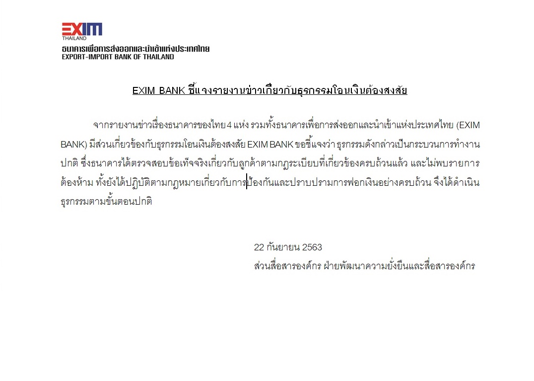 ธนาคารเพื่อการส่งออกและนำเข้าแห่งประเทศไทย (EXIM BANK) ระบุว่า จากรายงานข่าวเรื่องธนาคารของไทย 4 แห่ง ซึ่งปรากฎชื่อของ EXIM BANK รวมอยู่ด้วย มีส่วนเกี่ยวข้องกับธุรกรรมโอนเงินต้องสงสัยนั้น ขอชี้แจงว่าธุรกรรมดังกล่าวเป็นกระบวนการทำงานปกติ ซึ่งธนาคารได้ตรวจสอบข้อเท็จจริงเกี่ยวกับลูกค้าตามกฎระเบียบที่เกี่ยวข้องครบถ้วนแล้ว และไม่พบรายการต้องห้าม ทั้งยังได้ปฏิบัติตามกฎหมายเกี่ยวกับการป้องกันและปราบปรามการฟอกเงินอย่างครบถ้วน จึงได้ดำเนินธุรกรรมตามขั้นตอนปกติ.-สำนักข่าวไทย