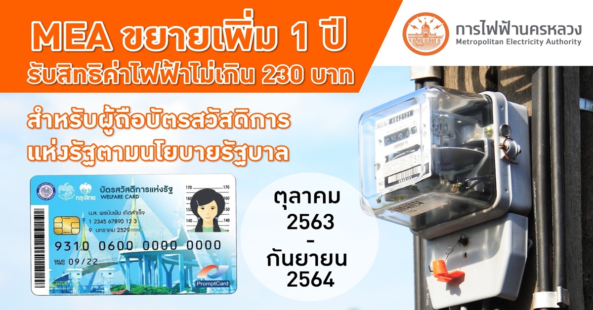 นางสาวผาสุก สัมปุณณะโชติ ผู้อำนวยการฝ่ายสื่อสารองค์กร การไฟฟ้านครหลวง หรือ MEA เปิดเผยว่า MEA ในฐานะหน่วยงานรัฐวิสาหกิจในสังกัดกระทรวงมหาดไทย มีหน้าที่ดูแลระบบไฟฟ้าในพื้นที่กรุงเทพมหานคร นนทบุรี และสมุทรปราการ พร้อมตอบรับนโยบายรัฐบาลขยายเวลาช่วยเหลือและบรรเทาภาระค่าไฟฟ้าให้แก่ผู้มีบัตรสวัสดิการแห่งรัฐ ต่อเนื่องเพิ่มเติมอีก 1 ปี ตั้งแต่เดือนตุลาคม 2563 – กันยายน 2564 ตามมติคณะรัฐมนตรี เมื่อวันที่ 22 กันยายน 2563 เห็นชอบการขยายเวลามาตรการบรรเทาภาระค่าไฟฟ้าโดยใช้ไฟฟ้าไม่เกิน 50 หน่วยต่อเดือนติดต่อกันเป็นระยะเวลา 3 เดือน ให้ใช้สิทธิค่าไฟฟ้าฟรีตามมาตรการที่มีอยู่ในปัจจุบัน แต่หากใช้ไฟฟ้าเกิน 50 หน่วยต่อเดือน ให้ใช้สิทธิตามมาตรการนี้ในวงเงิน 230 บาทต่อครัวเรือนต่อเดือน กรณีที่ใช้เกินวงเงินที่กำหนด ผู้มีบัตรฯ เป็นผู้รับภาระค่าไฟฟ้าทั้งหมด.-สำนักข่าวไทย