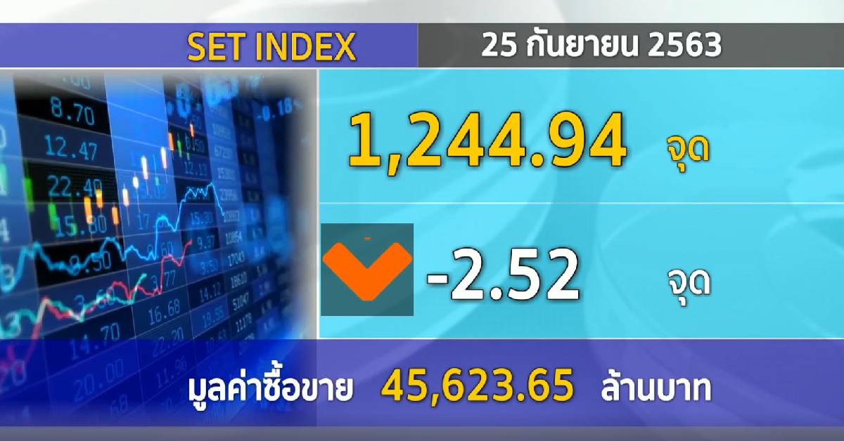 ตลาดหลักทรัพย์ฯ 25 ก.ย.-ตลาดหลักทรัพย์ปิดวันนี้ที่ระดับ 1,244.94 จุด ลดลง 2.52 จุด (-0.20%) มูลค่าการซื้อขาย 45,623.65 ล้านบาท