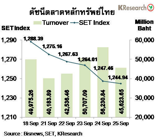 ด้านดัชนี ตลาดหุ้นไทย ปรับตัวลงตลอดสัปดาห์ โดยดัชนี SET ปิดที่ระดับ 1,244.94 จุด ลดลง ร้อยละ3.37 จากสัปดาห์ก่อน ขณะที่มูลค่าการซื้อขายเฉลี่ยต่อวันอยู่ที่ 47,056.39 ล้านบาท เพิ่มขึ้นร้อยละ 0.97 จากสัปดาห์ก่อน ส่วนดัชนี mai เพิ่มขึ้นร้อยละ 1.96 จากสัปดาห์ก่อน มาปิดที่ 316.67 จุด หุ้นไทยปรับตัวลงตามแรงขายของกลุ่มนักลงทุนสถาบันและต่างชาติ ท่ามกลางความกังวลต่อปัจจัยเสี่ยงทั้งในและต่างประเทศ อาทิ สถานการณ์การเมืองในประเทศ การฟื้นตัวของเศรษฐกิจโลกและเศรษฐกิจไทย สถานการณ์โควิด-19 ในต่างประเทศ