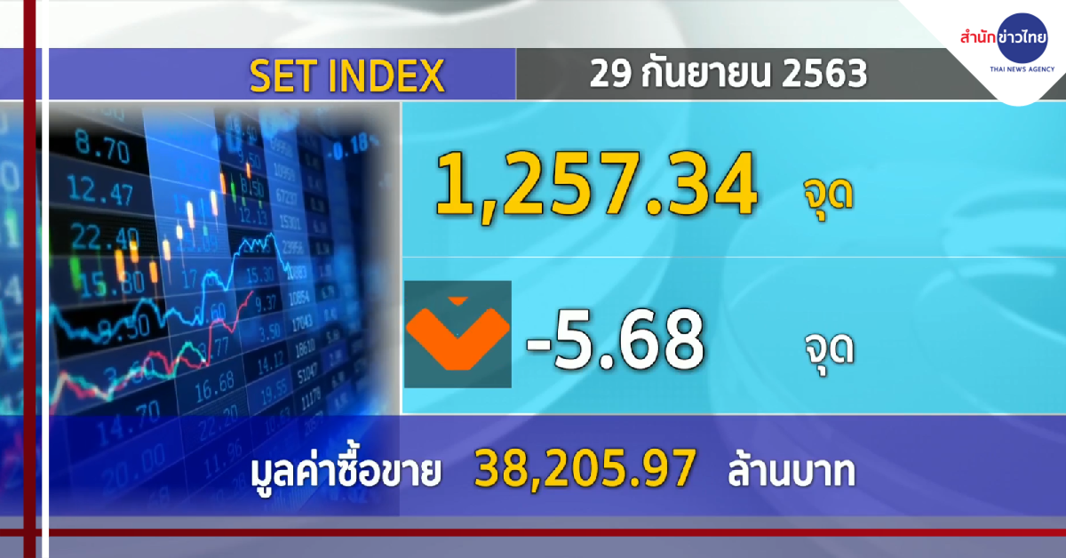 กรุงเทพฯ 29 ก.ย.–หุ้นไทยปิดวันนี้ (29 ก.ย.) ที่ระดับ 1,257.34 จุด ลดลง 5.68 จุด มูลค่าการซื้อขาย 38,205.97 ล้านบาท
