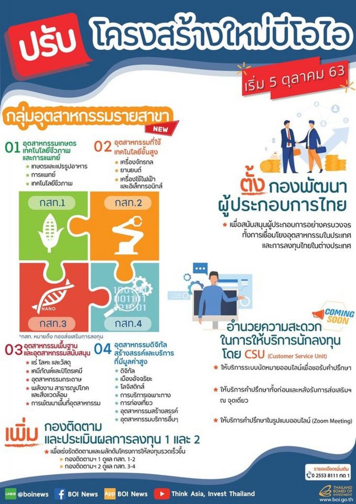 กรุงเทพฯ 5 ต.ค. – บีโอไอปรับโครงสร้างองค์กรครั้งใหญ่ สอดคล้องสภาพแวดล้อมการลงทุนสมัยใหม่ ปรับโฉมกองพัฒนาผู้ประกอบการไทย หนุนลงทุนในต่างประเทศ