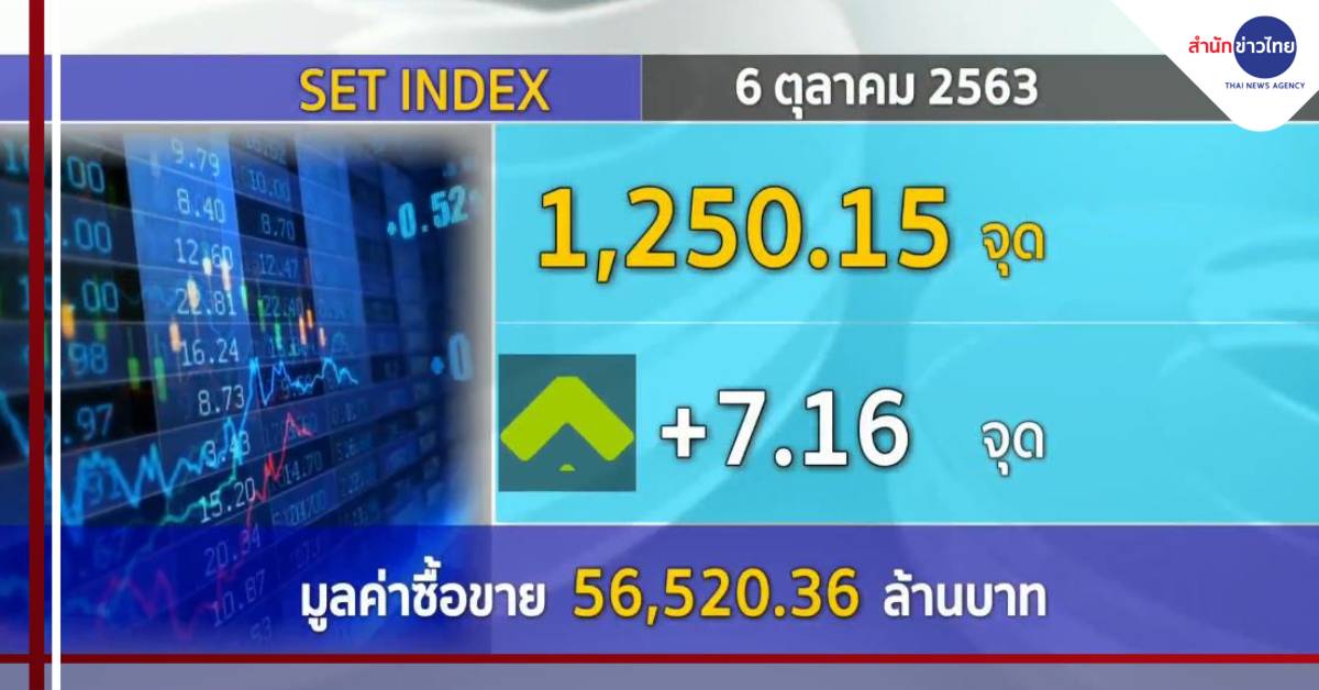 กรุงเทพฯ 6 ต.ค. – ตลาดหลักทรัพย์ฯ ปิดวันนี้ (6 ต.ค.) ที่ระดับ 1,250.15 จุด เพิ่มขึ้น 7.16 จุด หรือ 0.58% มูลค่าการซื้อขาย 56,520.36 ล้านบาท