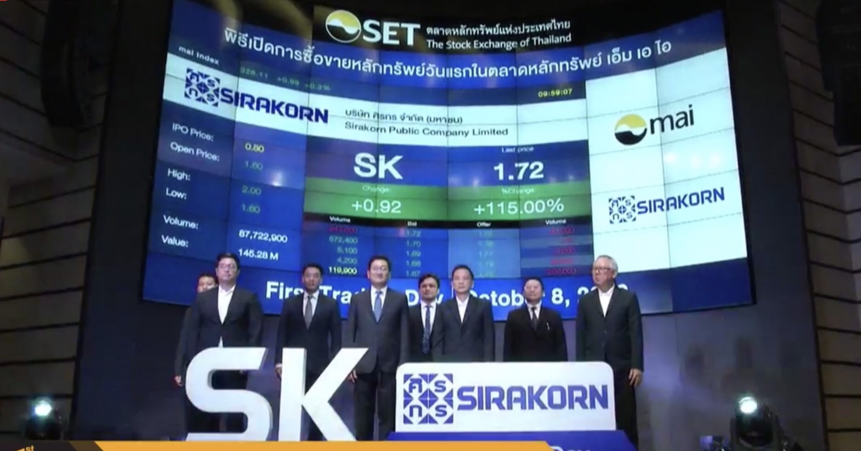 บริษัท ศิรกร จำกัด (มหาชน) หรือ SK เข้าซื้อขายในตลาดหลักทรัพย์เอ็ม เอ ไอ (mai) เป็นวันแรก ในหมวดวัสดุก่อสร้าง โดยดำเนินธุรกิจผลิตและจำหน่ายผลิตภัณฑ์คอนกรีตอัดแรง เช่น เสาไฟฟ้า เสาเข็ม เสาตอม่อ ฐานราก แผ่นพื้นสะพาน เป็นต้น มีโรงงานผลิต 6 แห่ง ตั้งอยู่ที่จังหวัดกาฬสินธุ์ ชลบุรี ชัยนาท ลำปาง สุราษฎ์ธานี และสงขลา ครอบคลุมการจำหน่ายทั่วประเทศไทย และธุรกิจให้บริการงานรับเหมาก่อสร้างสายส่งงานไฟฟ้าและงานโยธา โดยมีมูลค่าหลักทรัพย์ ณ ราคา IPO 368 ล้านบาท ซึ่งได้เปิดระดมทุนวันแรกวันนี้ (8 ต.ค.) ราคาพุ่งขึ้น 120% จากราคา IPO 0.80 บาท/หุ้น ขึ้นเป็น 1.60 บาท/หุ้น