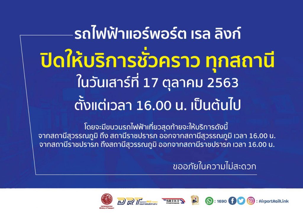ขณะที่รถไฟฟ้าแอร์พอร์ตเรลลิงก์ แจ้งมีความจำเป็นต้องปิดให้บริการทุกสถานีชั่วคราว ตั้งแต่เวลา 16.00 น. เป็นต้นไป โดยจะมีขบวนรถไฟฟ้าเที่ยวสุดท้ายจะให้บริการดังนี้