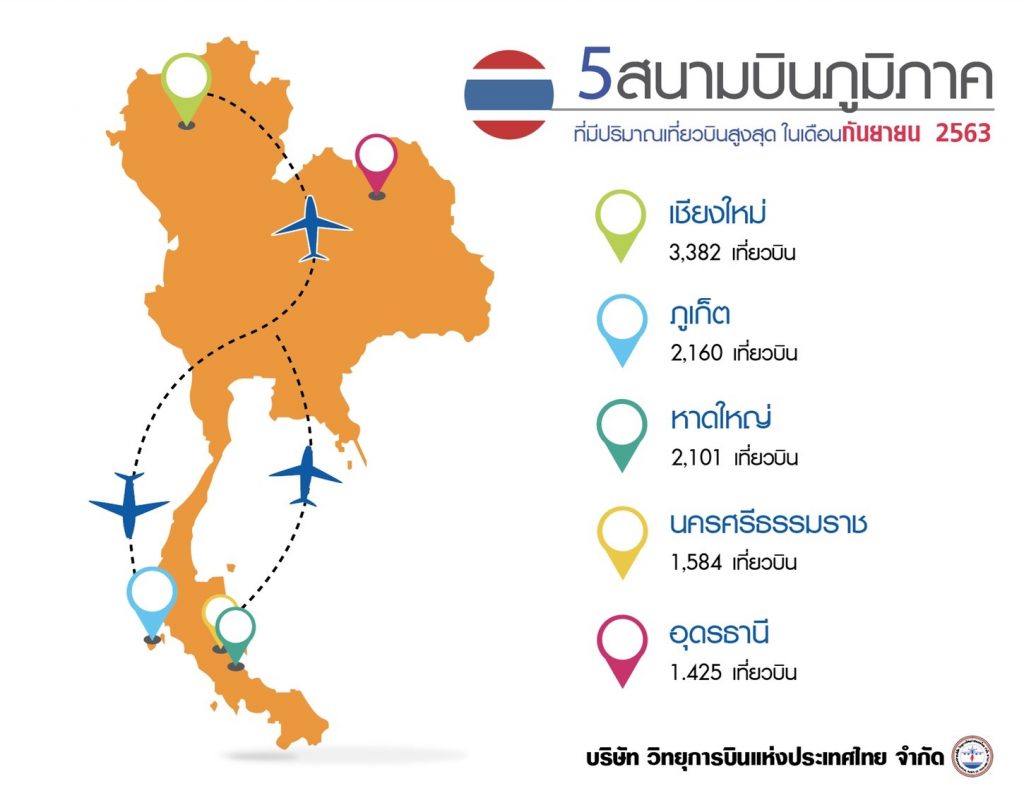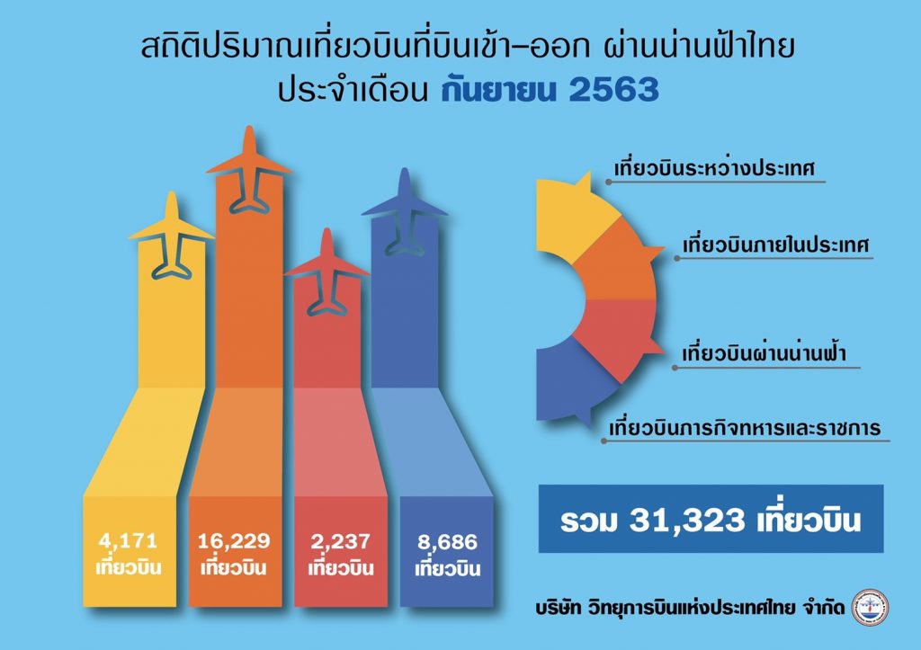 ล่าสุดบริษัท วิทยุการบินแห่งประเทศไทย จำกัด (บวท.) ได้สรุปสถิติปริมาณเที่ยวบินเดือนกันยายน 2563 โดยให้บริการควบคุมจราจรทางอากาศ แบ่งเป็น เที่ยวบินระหว่างประเทศ 4,171 เที่ยวบิน เที่ยวบินภายในประเทศ 16,229 เที่ยวบิน เที่ยวบินผ่านน่านฟ้า 2,237 เที่ยวบิน และเที่ยวบินสนับสนุนการปฏิบัติภารกิจทางทหารและราชการ 8,686 เที่ยวบิน