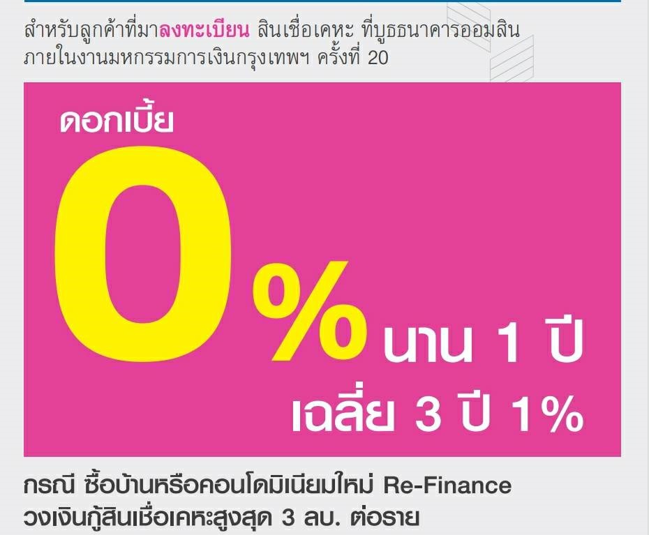 ด้านโปรโมชั่นเงินกู้ ประกอบด้วย สินเชื่อเคหะ สำหรับผู้ที่กำลังตัดสินใจซื้อที่อยู่อาศัย ปลูกสร้าง ต่อเติมซ่อมแซม หรือไถ่ถอนจำนองจากสถาบันการเงินอื่น อัตราดอกเบี้ยปีแรกคงที่ 0% ปีที่ 2 = 3.00% ต่อปี ปีที่ 3 = 3.750% ต่อปี จากนั้นปีที่ 4 เป็นต้นไป คิดอัตราดอกเบี้ย MRR-1.250% ต่อปี (ปัจจุบัน MRR ของธนาคารฯ = 6.245%) รวมแล้วอัตราดอกเบี้ยเฉลี่ย 3 ปี อยู่ที่ 2.250% ซึ่งนอกจากโปรโมชั่น 0% แล้ว สำหรับลูกค้าที่จะจองสิทธิ์สินเชื่อเคหะวงเงินสินเชื่อสูงสุด 3 ล้านบาทต่อราย ในวันที่ 22 และ 24 ตุลาคม 2563 เวลา 16.00 น. จำนวน 50 รายแรกต่อวัน จะได้รับอัตราดอกเบี้ยพิเศษ 0% นาน 1 ปี เฉลี่ย 3 ปี 1.00% อีกด้วย ทั้งนี้ ลูกค้าต้องได้รับอนุมัติและจัดทำนิติกรรมสัญญาให้แล้วเสร็จภายในวันที่ 30 ธันวาคม 2563
