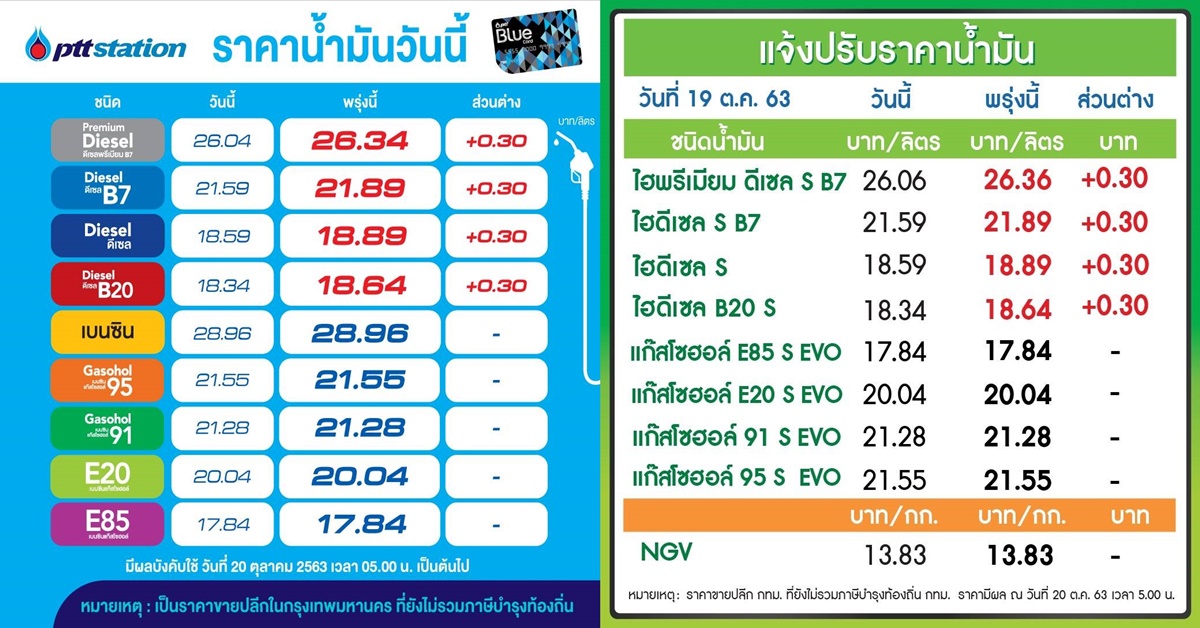 PTT Station –บางจากฯ ปรับราคาขายปลีกน้ำมันกลุ่มดีเซลทุกชนิดขึ้น 30 สตางค์ต่อลิตร ส่วนกลุ่มเบนซินและแก๊สโซฮอลล์ทุกชนิดคงเดิม มีผล 20 ตุลาคม 2563 เวลา 05.00 น. เป็นต้นไป โดยราคาขายปลีกจะเป็นดังนี้ เบนซิน 28.96 บาท แก๊สโซฮอล์ 95 อยู่ที่ 21.55 บาท E20 อยู่ที่ 20.04 บาท แก๊สโซฮอล์ 91 อยู่ที่ 21.28 บาท E85 อยู่ที่ 17.84 บาท B7 อยู่ที่ 21.89 บาท B10 อยู่ที่ 18.89 บาท B20 อยู่ที่ 18.64 บาท และดีเซลพรีเมี่ยม B7 อยู่ที่ 26.34 บาทต่อลิตร โดยราคาขายปลีกข้างต้นยังไม่รวมภาษีบำรุงกรุงเทพมหานคร.-สำนักข่าวไทย
