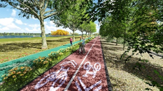 ทางเดินเท้ากว้างประมาณ 2.5 เมตร และทางจักรยานกว้างประมาณ 3.0 เมตร แยกออกจากกันโดยติดตั้งขนานถนนสายประธานตลอดแนวเขตทาง