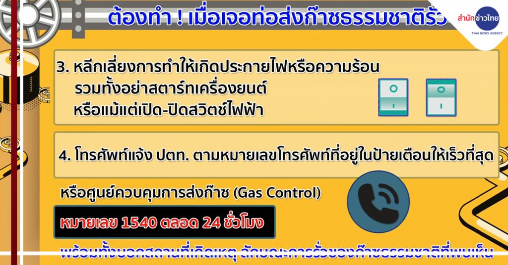 - โทรศัพท์แจ้ง ปตท. ตามหมายเลขโทรศัพท์ที่อยู่ในป้ายเตือนให้เร็วที่สุด หรือศูนย์ควบคุมการส่งก๊าซ (Gas Control) หมายเลข 1540 ตลอด 24 ชั่วโมง พร้อมทั้งบอกสถานที่เกิดเหตุ และลักษณะการรั่วของก๊าซธรรมชาติที่พบเห็น .- สำนักข่าวไทย