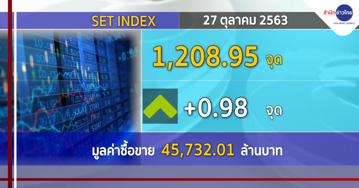 กรุงเทพฯ 27 ต.ค. – ดัชนีหุ้นไทยวันนี้ ปิดที่ระดับ 1,208.95 จุด เพิ่มขึ้น 0.98 จุด หลังนายกรัฐมนตรีส่งสัญญาณสนับสนุนการแก้ไขรัฐธรรมนูญ
