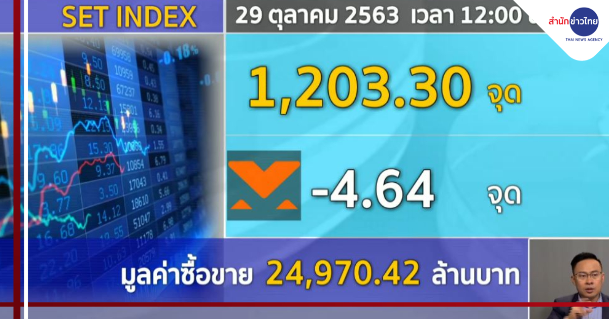 ตลาดหุ้นไทยในภาคเช้า ดัชนีร่วงกว่า 10 จุด ก่อนจะฟื้นตัวเล็กน้อย ดัชนีหลุดระดับ 1,200 จุดอีกครั้ง ตามทิศทางตลาดหุ้นทั่วโลกที่ปรับลดลง จากความกังวลจำนวนผู้ติดเชื้อโควิด-19 ที่เพิ่มขึ้น จนหลายประเทศมีมาตรการล็อกดาวน์รอบใหม่ โดยเฉพาะในยุโรป ประกอบกับราคาย้ำมันร่วงหนัก กระทบต่อบรรยากาศการลงทุน ดัชนีช่วงเที่ยงลดลง 4.64 จุด ที่ระดับ 1,203.30 จุด มูลค่าการซื้อขาย 24,970.42 ล้านบาท