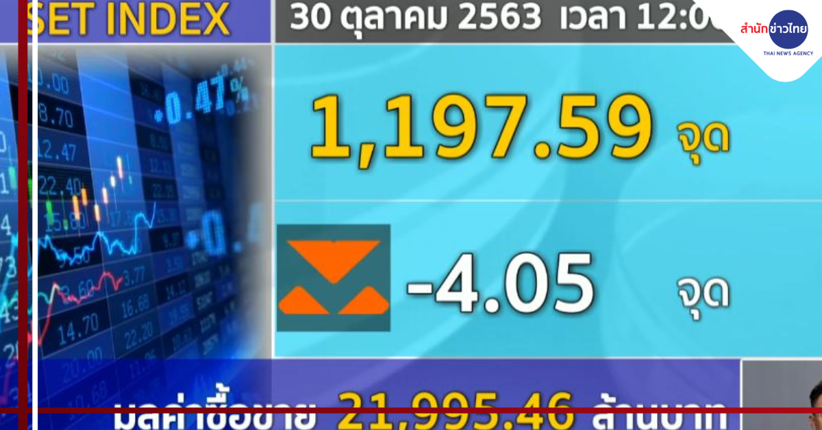 กทม. 30 ต.ค. – ตลาดหุ้นไทยช่วงเที่ยงลดลง 4.05 จุด ที่ระดับ 1,197.59 จุด มูลค่าการซื้อขาย 21,995.46 ล้านบาท หลังไร้ปัจจัยสนับสนุน และยังกังวลการระบาดของโควิด-19 จะกระทบเศรษฐกิจ