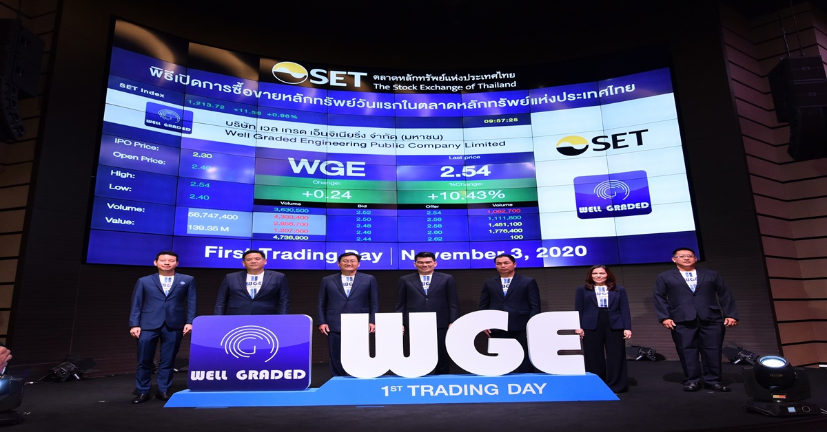 ตลท. 3 พ.ย. – WGE เปิดเทรดวันแรก 2.40 บาท เพิ่มขึ้น 4.35% จากราคาขาย IPO ที่ 2.30 บาท/หุ้น
