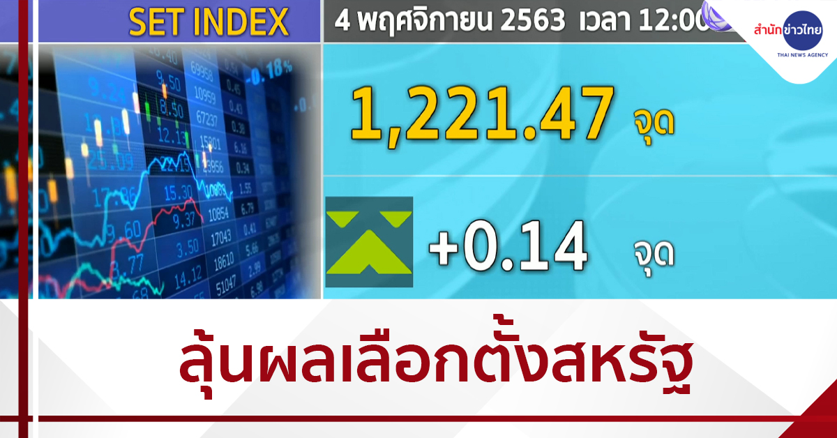 4 พ.ย.-ตลาดหุ้นไทยภาคเช้าบวก นักลงทุนลุ้นผลการเลือกตั้งประธานาธิบดีสหรัฐ หลังนายโจ ไบเดน มีคะแนนนำนายโดนัล ทรัมป์