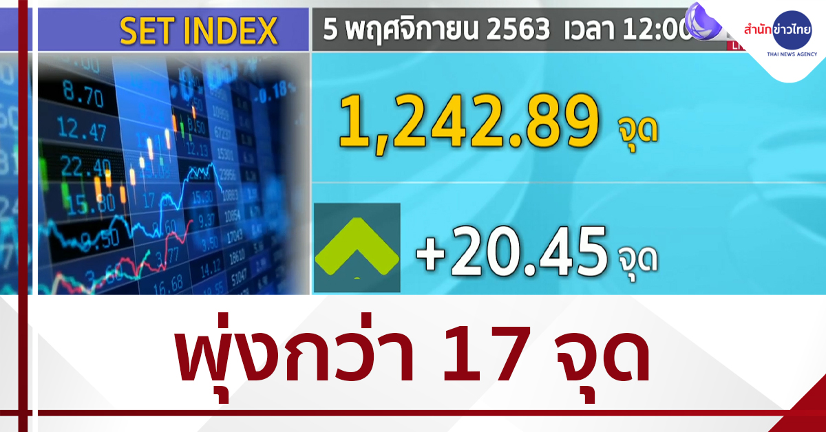 5 พ.ย.-ตลาดหุ้นไทยภาคเช้าพุ่งกว่า 17 จุด ตามทิศทางนักลงทุนให้น้ำหนักกับการเลือกตั้งประธานาธิบดีสหรัฐ หลังนายโจ ไบเดน มีคะแนนนำนายโดนัล ทรัมป์