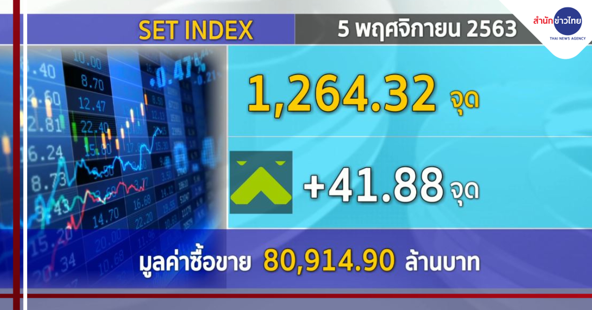 กทม. 5 พ.ย. – ตลาดหุ้นไทยวันนี้ (5 พ.ย.) ปิดบวกแรง 41.88 จุด ที่ระดับ 1,264.32 จุด มูลค่าการซื้อขาย 80,914.90 ล้านบาท.-สำนักข่าวไทย