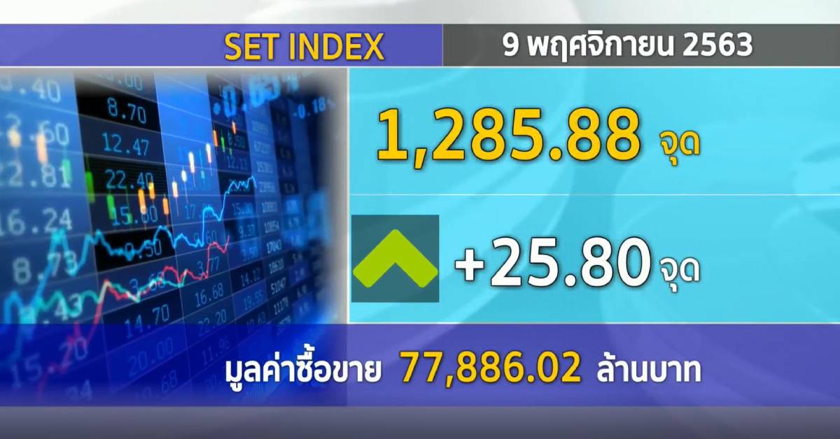 กทม. 9 พ.ย.-ตลาดหลักทรัพย์วันนี้ 9 พ.ย.63 ปิดที่ระดับ 1,285.88 จุด บวก 25.80 จุด มูลค่า 77,886.02 ล้านบาท