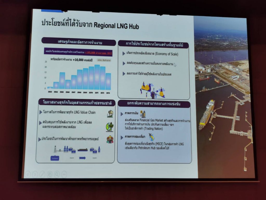 สำหรับการนำเข้าแอลเอ็นจีแล้วส่งออกเป็นแผนงานตามนโยบายรัฐที่ต้องการให้ไทยเป็นฮับแอลเอ็นจี ตั้งเป้าหมายสร้างรายได้ 165,000 ล้านบาทในช่วงเวลา 10 ปี จากปี 2563-2573 สร้างงาน 16,000 คน/ปี รวมทั้งเกิดธุรกิจ MICE เพิ่มขึ้นจากการเข้ามาศึกษาดูงาน.-สำนักข่าวไทย