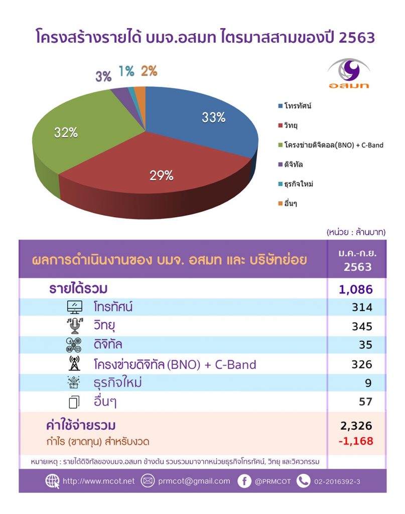 นายสิโรตม์ รัตนามหัทธนะ กรรมการและรักษาการในตำแหน่งกรรมการผู้อำนวยการใหญ่ บมจ.อสมท เปิดเผยว่า อสมท รายงานงบการเงินไตรมาส 3 ปี 2563 บริษัทมีผลขาดทุนไตรมาส 3 จำนวน 106 ล้านบาท โดยคิดเป็นการเปลี่ยนแปลงดีขึ้นถึงร้อยละ 42 เมื่อเทียบกับไตรมาสก่อนหน้า ส่งผล 9 เดือน ขาดทุน 1,168 ล้านบาท สาเหตุหลักมาจากการแพร่ระบาดของโควิด-19 ทำให้ภาคธุรกิจต้องควบคุมค่าใช้จ่ายการใช้งบโฆษณาและประชาสัมพันธ์ อย่างไรก็ตาม ในช่วง 9 เดือนแรกของปี 2563 อสมท มีรายได้ 1,086 ล้านบาท โดยเป็นรายได้ไตรมาส 3 ปี 2563 จำนวน 402 ล้านบาท เพิ่มขึ้นร้อยละ 26 จากไตรมาสก่อนหน้า