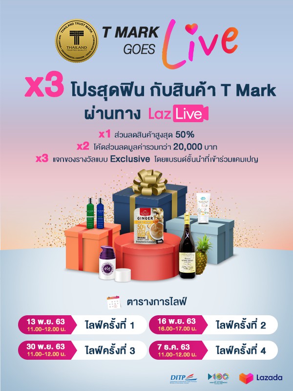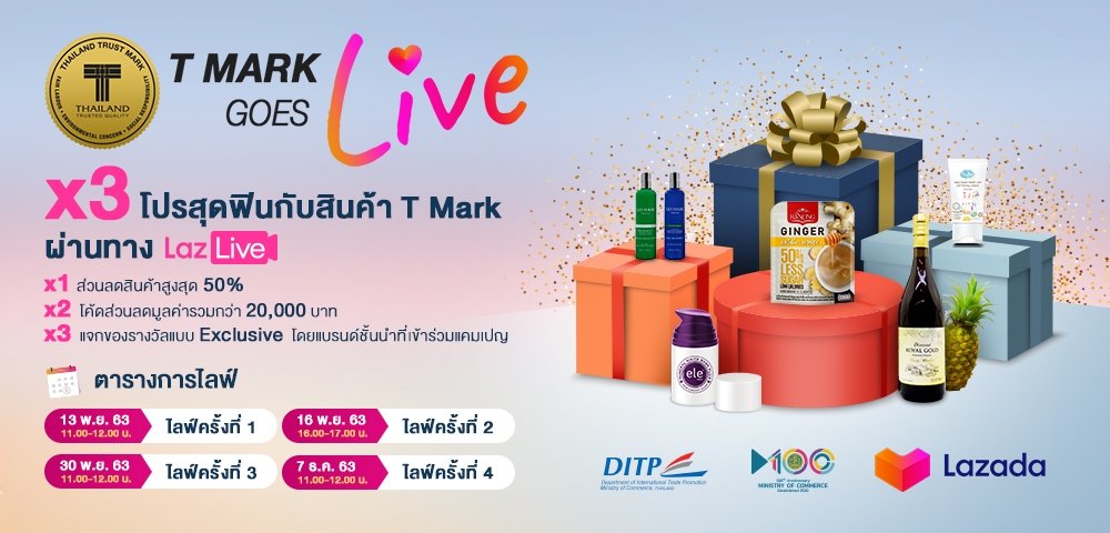 นอกจากนี้ กรมส่งเสริมการค้าระหว่างประเทศขนทัพแบรนด์สินค้าคุณภาพชั้นนำที่ได้รับตราสัญลักษณ์ T Mark เข้าร่วมแคมเปญ T Mark Goes Live กว่า 30 แบรนด์ ภายในการไลฟ์กรมได้จัดเตรียมโปรโมชั่นสุดฟินแบบยกกำลังสามเพื่อมอบเป็นของขวัญให้กับผู้บริโภคสำหรับเทศกาลจับจ่ายในช่วงเดือนพฤศจิกายนและธันวาคม ได้แก่ ส่วนลดสินค้าจากแบรนด์ที่เข้าร่วมแคมเปญสูงสุดถึงร้อยละ 50 ส่วนลดให้ผู้ที่เข้าชมไลฟ์มูลค่ารวมกว่า 20,000 บาท ของรางวัลแบบ Exclusive โดยแบรนด์ชั้นนำที่เข้าร่วมแคมเปญ