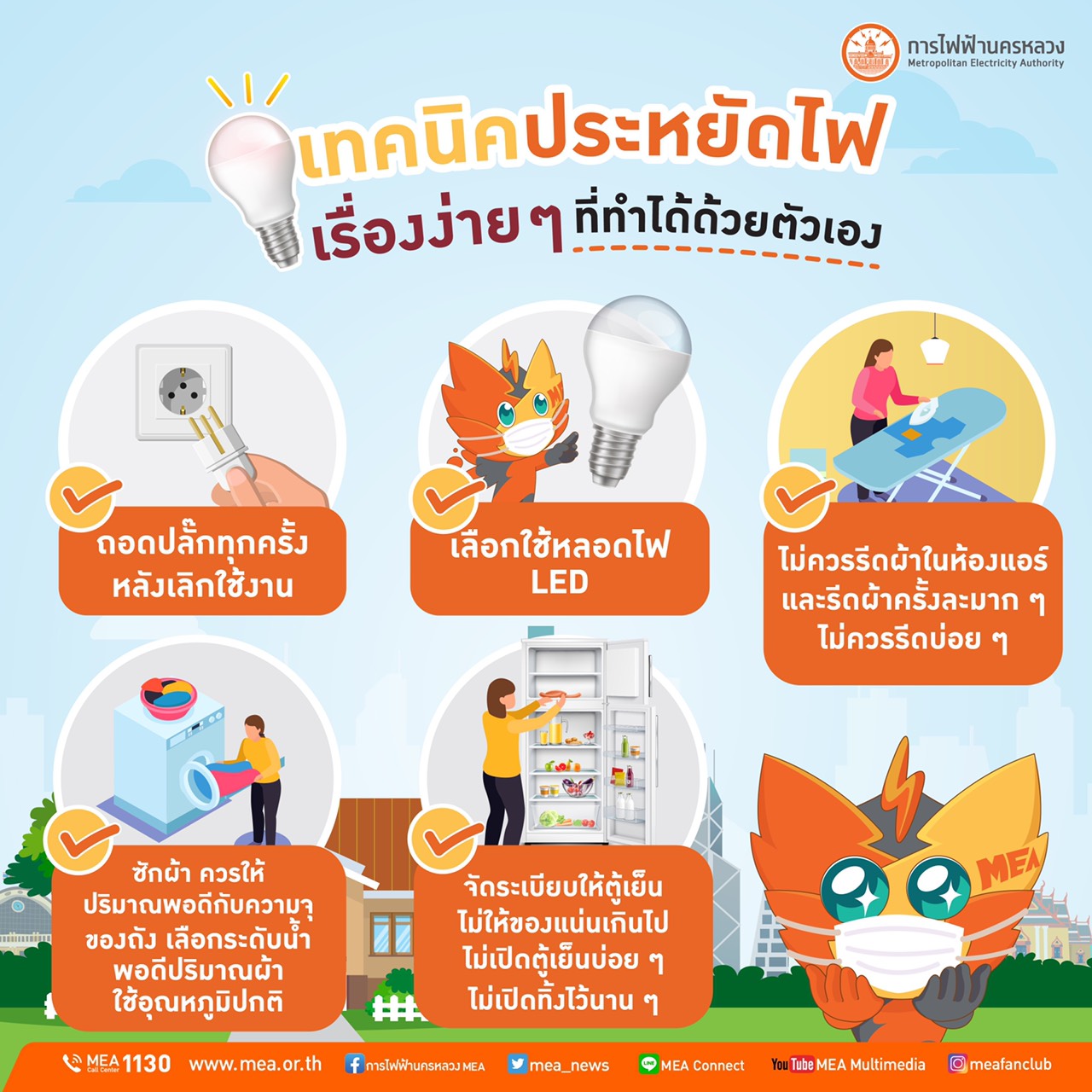 สำนักข่าวไทย 14 พ.ย.- MEA เจิดจ้า มาบอก ! เทคนิคประหยัดไฟ เรื่องง่าย ๆ ที่ใคร ๆ ก็ทำได้ที่บ้านด้วยตัวเอง สบายใจ หายห่วง