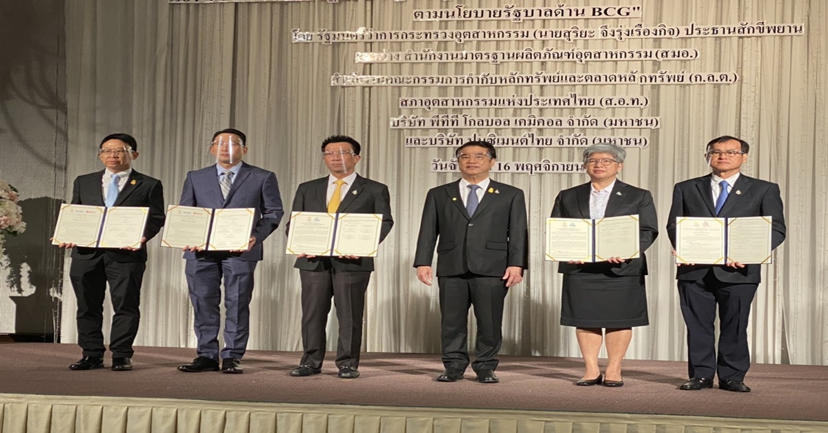 นายสุริยะ จึงรุ่งเรืองกิจ รัฐมนตรีว่าการกระทรวงอุตสาหกรรม กล่าวภายหลังเป็นประธานและสักขีพยานในพิธีลงนามบันทึกข้อตกลงความร่วมมือเพื่อส่งเสริมมาตรฐานเศรษฐกิจหมุนเวียน (Circular Economy) ไปใช้ในภาคอุตสาหกรรม ตามนโยบายรัฐบาลด้าน BCG ระหว่างสำนักงานมาตรฐานผลิตภัณฑ์อุตสาหกรรม (สมอ.) สำนักงานคณะกรรมการกำกับหลักทรัพย์และตลาดหลักทรัพย์ (ก.ล.ต.) สภาอุตสาหกรรมแห่งประเทศไทย (ส.อ.ท.) บริษัท พีทีที โกลบอล เคมิคอล จำกัด (มหาชน)หรือจีซี และบริษัท ปูนซิเมนต์ไทย จำกัด (มหาชน) หรือเอสซีจี ว่า ปัญหาสิ่งแวดล้อมเป็นปัญหาสำคัญระดับโลกที่หลายประเทศทั่วโลกให้ความสำคัญ และนำมาเป็นเครื่องมือในการกีดกันทางการค้า โดยเฉพาะภาคอุตสาหกรรมที่ถูกมองว่าเป็นต้นเหตุในการทำลายสิ่งแวดล้อม